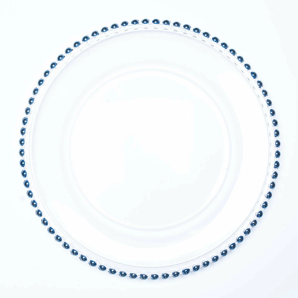 This new addition to our charger plate category is spectacular! This clear glass plate with blue painted beaded edging is simply stunning; and adds the perfect touch to your table! This charger plate is a great choice for those that might not want to use a traditional charger plate; but still have the sophisticated look! Not only are Charger Plates a beautiful and elegant addition to your table top, they protect your linens. Great in any setting – use for weddings, parties, and special events!Â