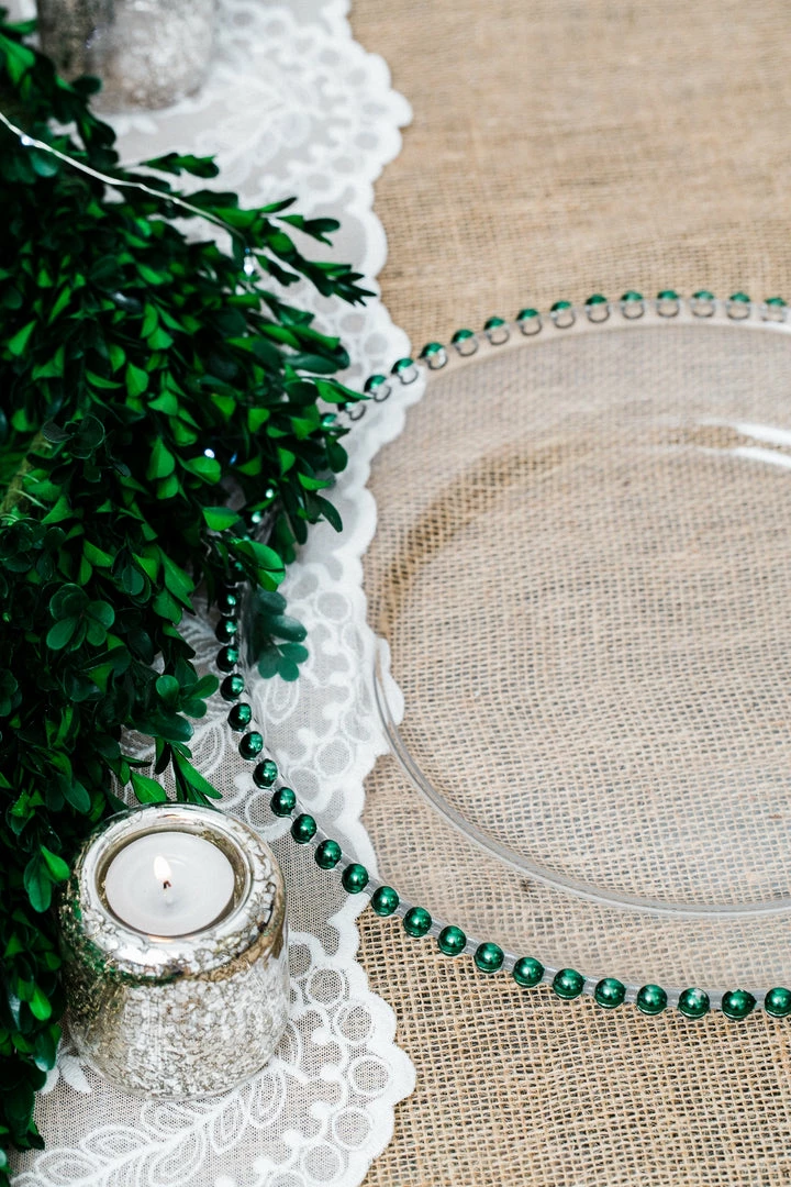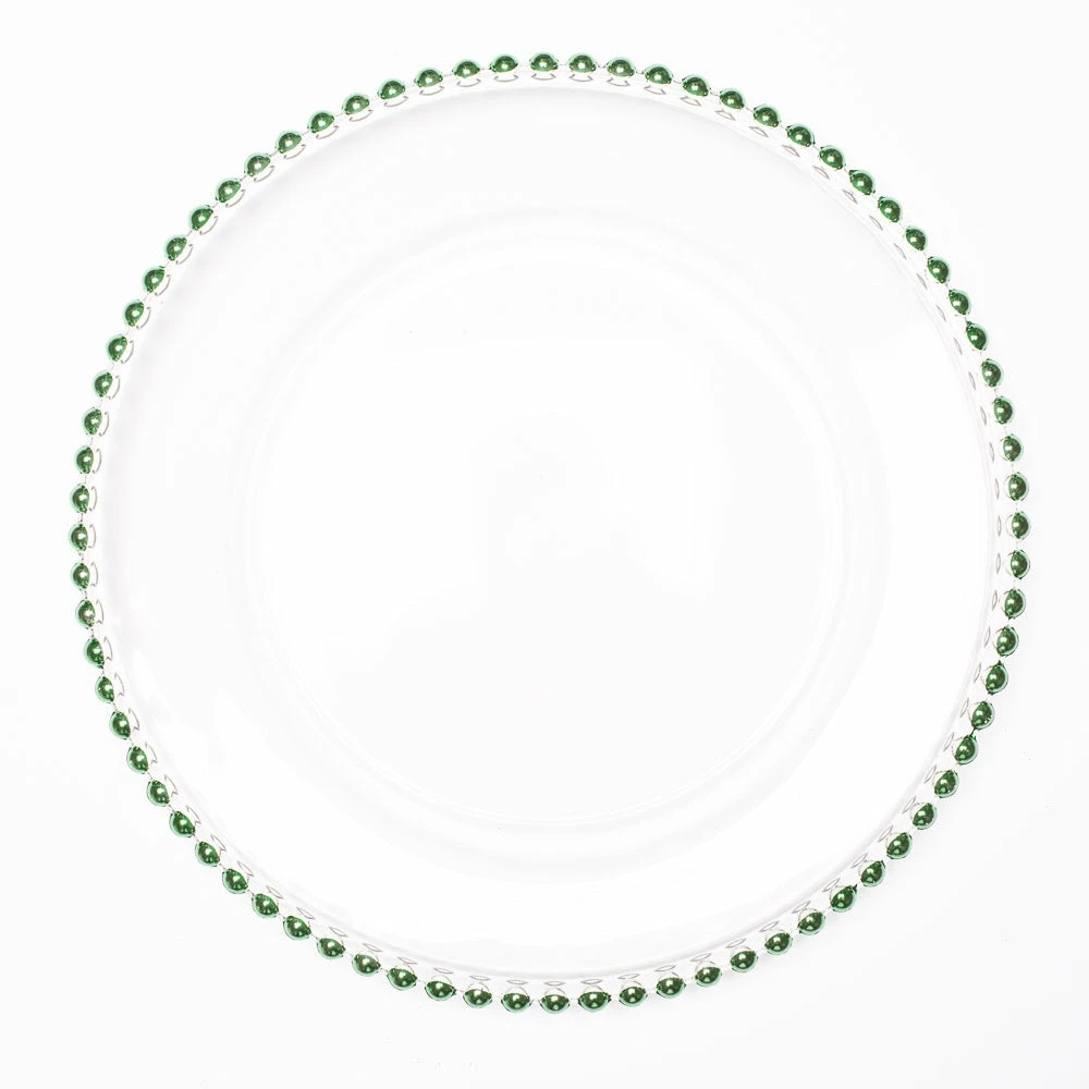 This new addition to our charger plate category is spectacular! This clear glass plate with green painted beaded edging is simply stunning; and adds the perfect touch to your table! This charger plate is a great choice for those that might not want to use a traditional charger plate; but still have the sophisticated look! Not only are Charger Plates a beautiful and elegant addition to your table top, they protect your linens. Great in any setting – use for weddings, parties, and special events!Â
