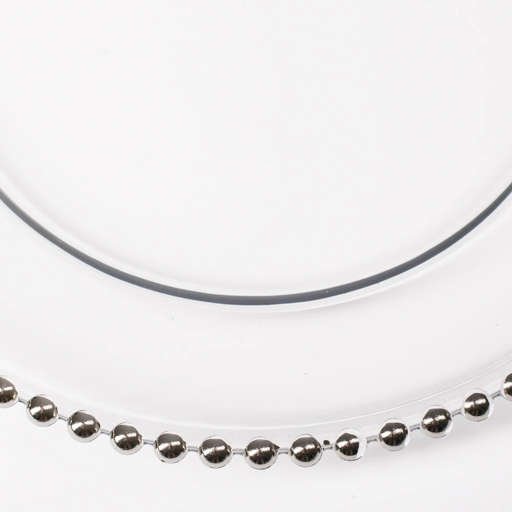 This new addition to our charger plate category is spectacular! This clear glass plate with silver painted beaded edging is simply stunning; and adds the perfect touch to your table! This charger plate is a great choice for those that might not want to use a traditional charger plate; but still have the sophisticated look! Not only are Charger Plates a beautiful and elegant addition to your table top, they protect your linens. Great in any setting – use for weddings, parties, and special events!Â