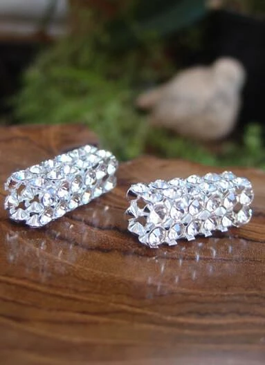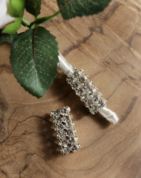 Set of two. Each of the Rhinestone Boutonniere collars are 1in x 3/8in with 45 clear glass rhinestone diamonds. EAch end is open for boutonniere stem. The opening is 1/4in wide To secure it to the boutonniere: Place a drop of corsage glue on the stem then slide on.