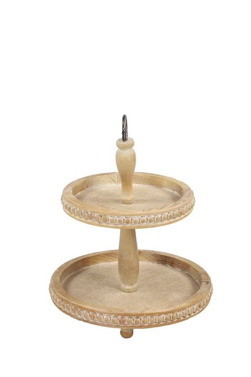 Natural beige birch wood forms this tall, 2-tier tray stand with round wood serving trays. The textural birch wood with whitewash finish adds an earthy, natural touch while the decorative wood bead trim and feet add a simple, relaxed style element.