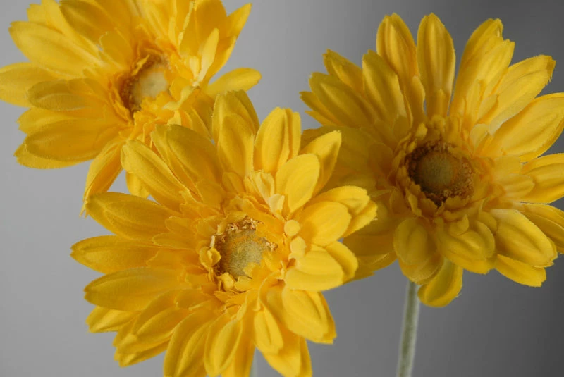 Add a cheerful splash of color to your home or party with these yellow Gerbera daisies. It will bring freshness and zest to its environment. These flowers come in bunches of 24, each measuring 12in tall. Each blossom measures 3in wide.