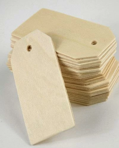 Quality Wood Tags. Pack of 25 tags with pre-dilled holes for hanging. Each measure 3.25in x 1 -5/8in wide and they are 1/8in thick. The perfect finishing touch to a craft project or use for gift wrapping. They can be stained, decoupaged or painted. You can use a wood burning tool, marker or sharpie on them. They are sanded smooth.