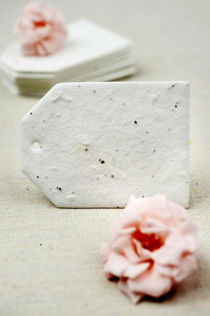 This is a set of 32 Large Seeded Hang Tags. These seed paper tags are printed on the back with the message: “This paper contains wildflower seeds!”. Each measures 2.5 inches wide by 3.375 inches tall. These seeded paper hang tags have been die-cut from handmade paper stock. They have 10 species of annual and perennial wildflower seeds embedded so they will sprout into a garden of flowers if planted and cared for. Use for escort cards and give your guests a garden to remember the event. The paper is 100% tree free cotton fibers and each is printed with Love. The unique blend of wildflower seeds has been carefully chosen to include seeds that will thrive in all of the growing regions in North America. The plants tolerate partial shade, need four hours a day of direct sunlight and grow to about three feet high. Seeds include Spurred Snapdragon,Tussock Bellflower, Creeping Thyme, Lilac Godetia, Foxglove, Catchfly, Monkeyflower, English Daisy, Red Corn Poppy and Showy Evening Primrose. Germination may begin as quickly as one week or may take up to six weeks depending on your growing zone, planting depth and season. We recommend just 1/4″ inch of soil coverage.