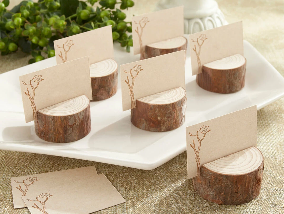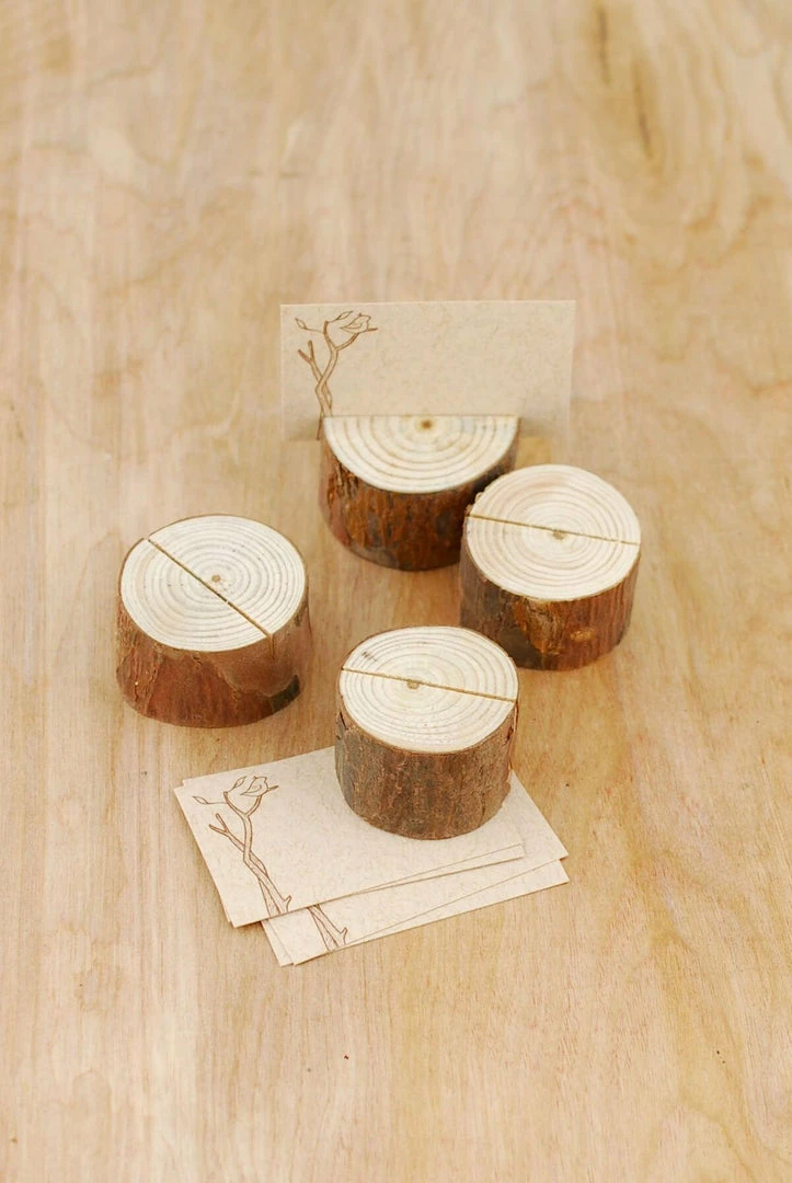 Evoke the charm of nature with these Wood Place Card Holders. These natural wood rounds will beautifully complement a woodland inspired event, or rustic wedding. The wood slices vary slightly in size, but measure roughly 1″ tall by 1.5″ wide. These attractive rounds come as a set of four and include place cards that are decorated on one side with a printed tree branch and bird.