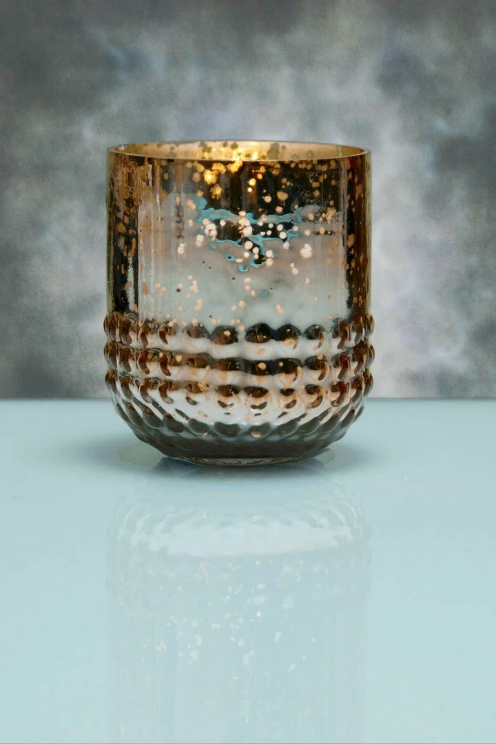 Give your tables a warm metallic glow with this set of six Array Rose Gold Votive Holders Mercury Glass. These glass candle holders have a semi-translucent dappled coating which allows candlelight to sparkle through in a rosy, warm hue. The hobnail detailing adds texture and flair. Place these holders on your fireplace mantel, reception tables, or throughout your home to add subtle, yet sophisticated detail.