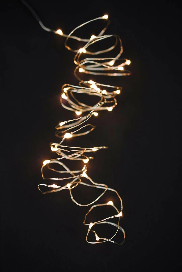 Features 36 dewdrop bulbs on a bendable silver wire, this string of super bright lights can be shaped and woven into floral arrangements or submersed inside a vase. The lights also feature three selectable modes: phasing, flashing, and steady on. The wire measures 9′ and connects to a battery pack.