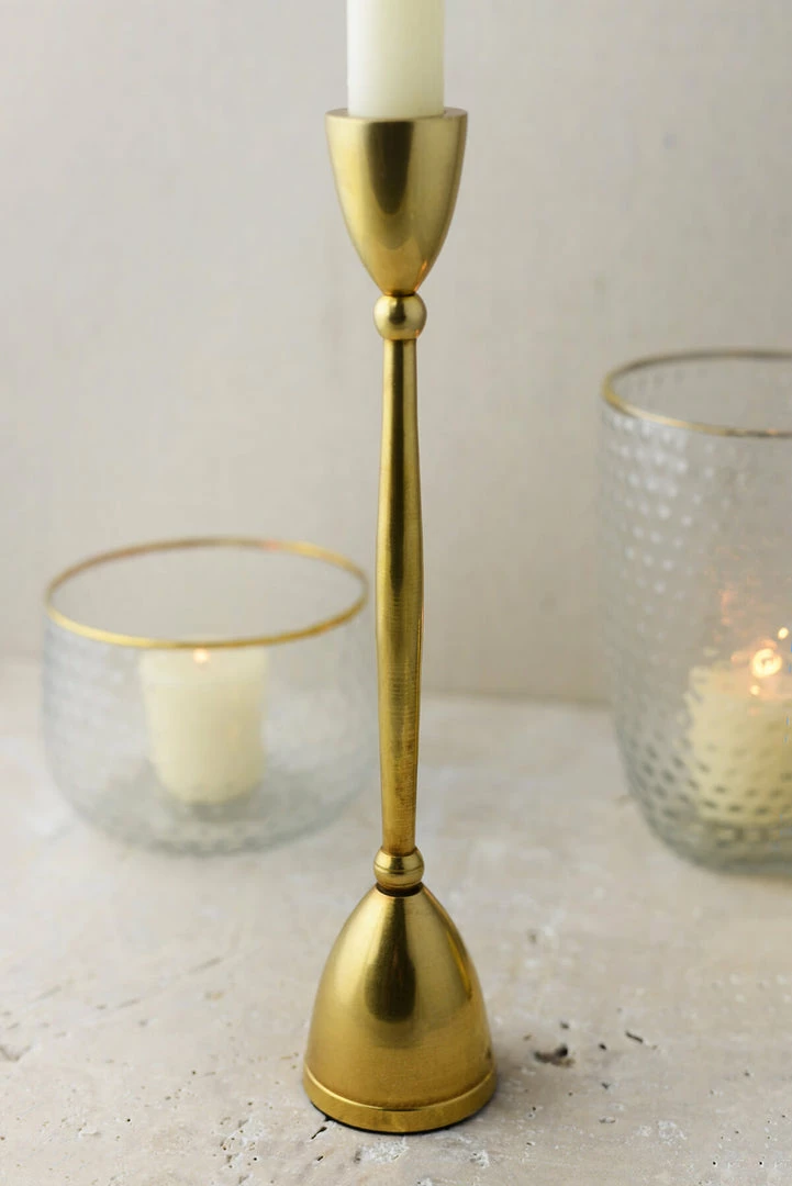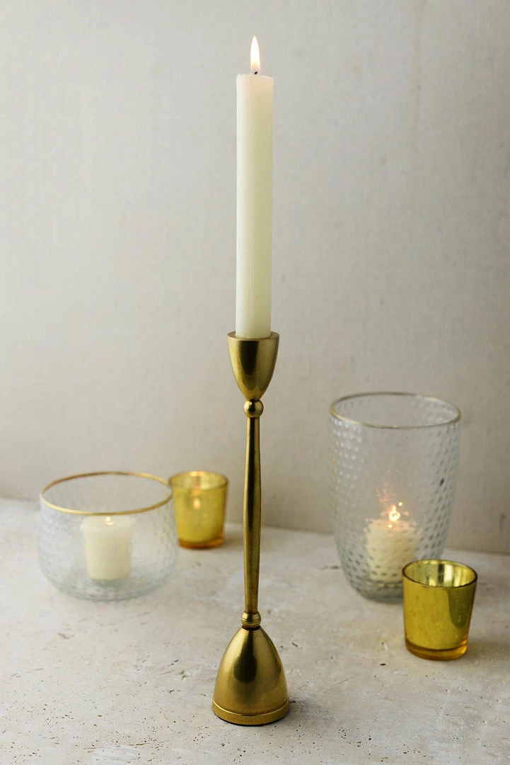 Celebrate special moments with this lovely Antique Gold Taper Candle Holder. This stylish piece boasts a sophisticated matte gold finish and elegant shape. Add these candle holders to your tables to add sophistication and a touch of romance. Great for weddings, special events, churches, and in the home! (1) Holder Included.Â