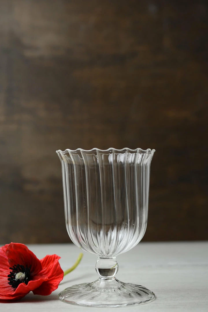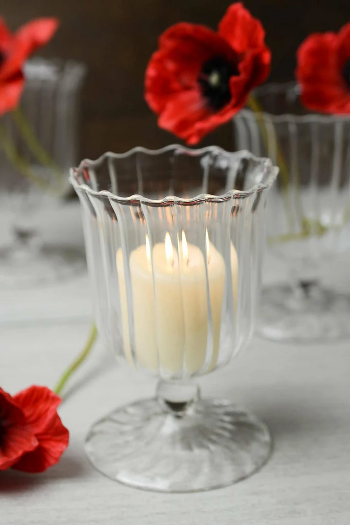 Clear glass pedestal votive holder with ribbed texture. 5″ tall x 3-1/2″ wide. Perfect for tabletops at weddings. Place a votive candle inside or use as vase and fill with fresh flowers.Â