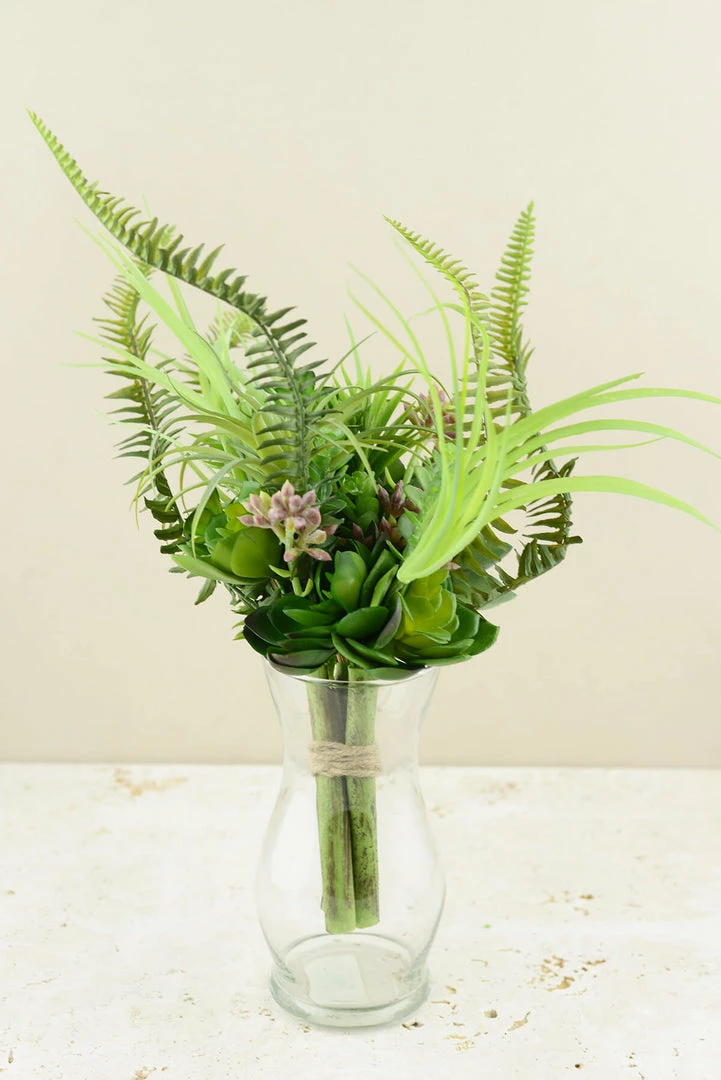 This faux bouquet of assorted succulents is great to add to silk flowers or use as filler for your arrangements. Contains artificial grasses, ferns, and echeveria, this bouquet is perfect to add to arrangements in need of greenery.