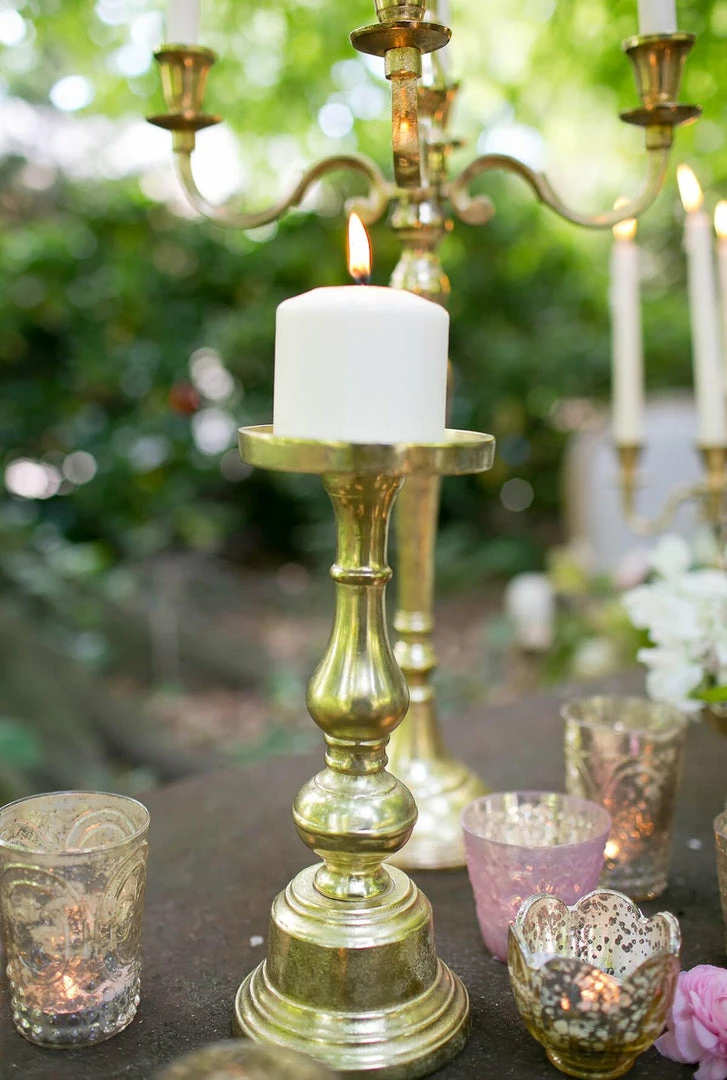 Place a pillar candle atop this tall, Athena Gold Pillar Candle Holder 11.25in for a regal look at your wedding or event! This metal candlestick with antique-look painted gold exterior and elegant shape pairs beautifully with both modern or traditional event décor. Surround this candlestick with mercury style glass votive holders for an enchanting tablescape. Add one of our bold colors of Richland Pillar Candles (our 4″ or 3″ diameter is recommended) and surround with silk rose petals for a spring soiree.