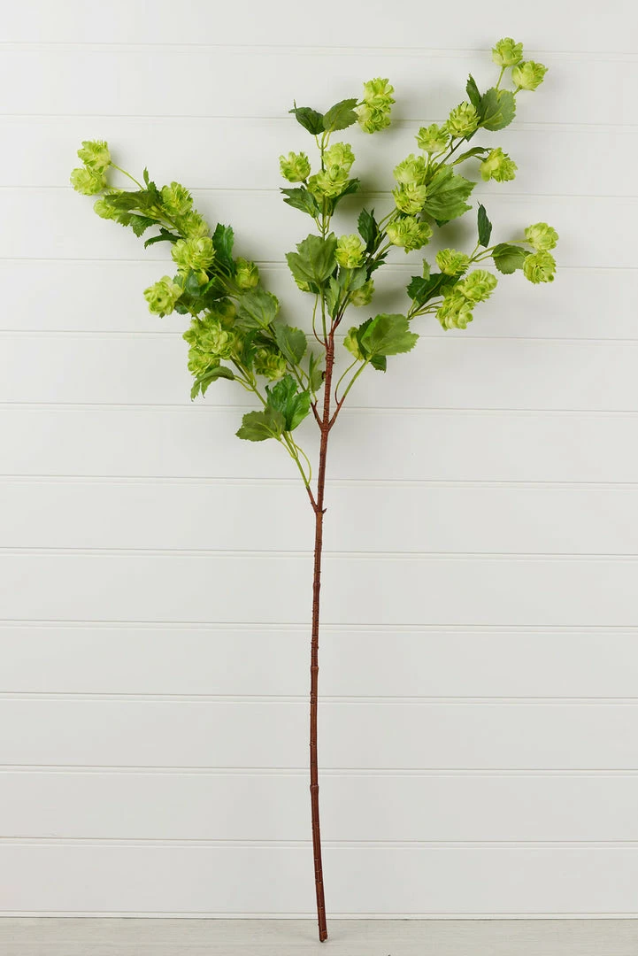 This lush blooming hops spray is filled hops and leaves made with poly silks. The stems are wired and can spread up to 26″ wide. This is a faux hops garland with hints of cream and green. It is 39″ long. For a lush garden wedding look, use the Hops spray to decorate chair backs, add to arrangements or to adorn your wedding arbor.