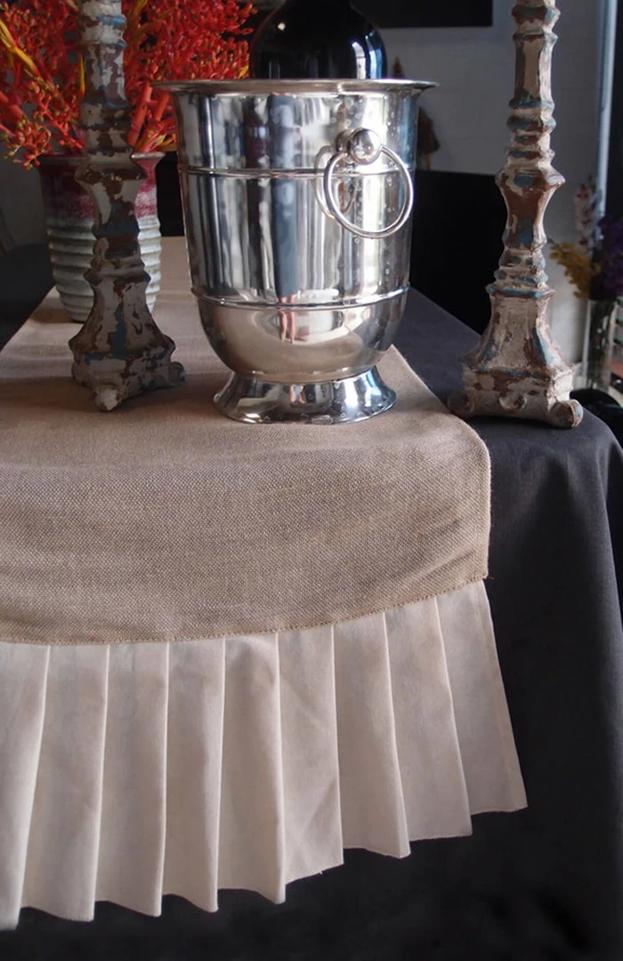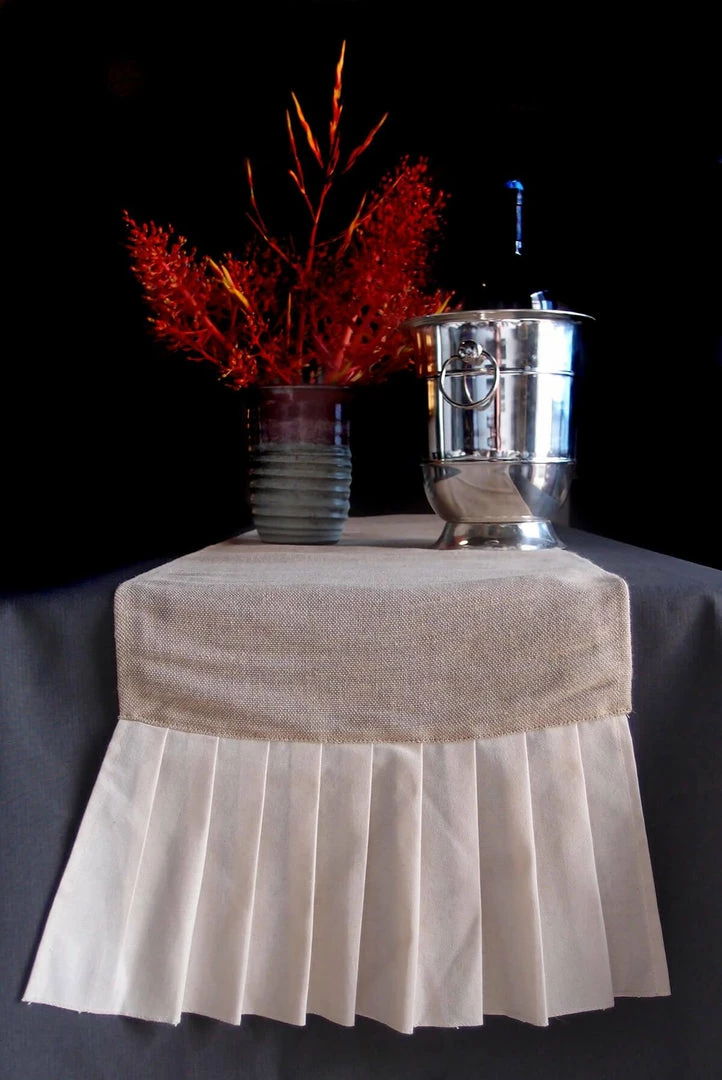Outfit your tables with this marvelous Burlap and Cotton Pleated Ruffle Table Runner. The table runner measures 114″ long by 14″ wide. Each end of the runner has 8″ long cotton pleated ruffles. Cotton/ jute blend.