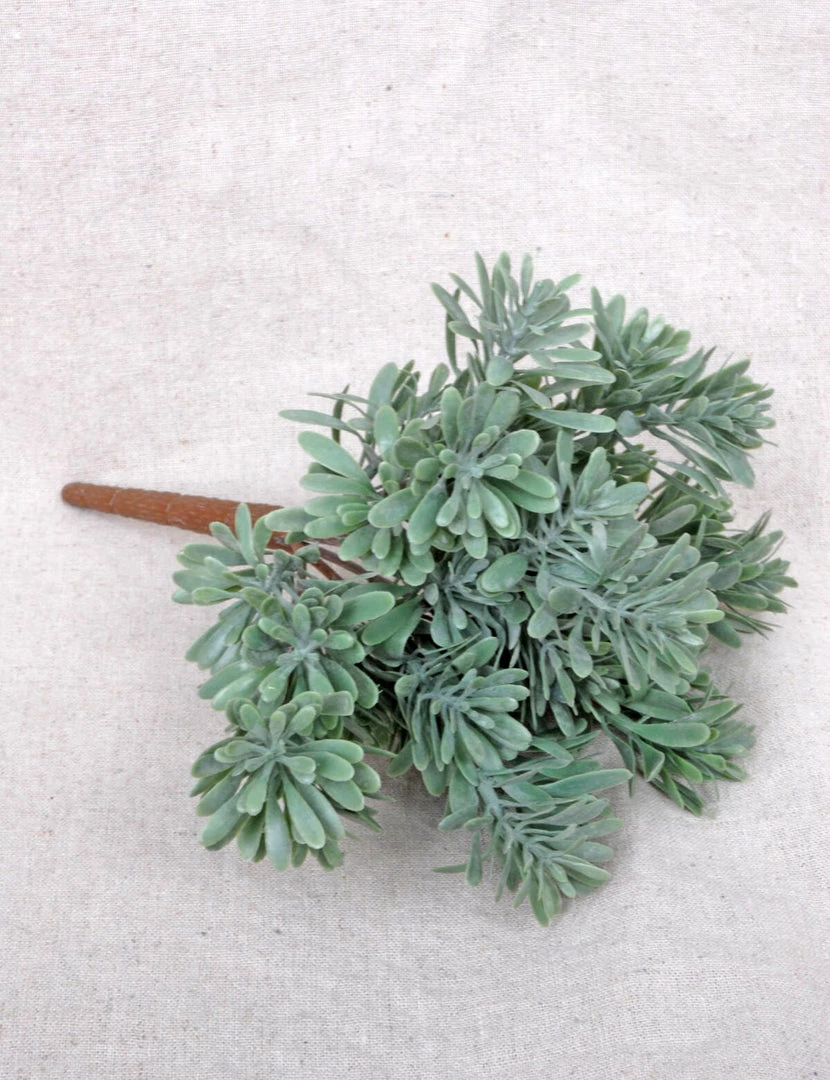 Give your floral arrangements a soft hint of greenery with this Frosted Green Succulent Bush Pick. Use this 9″ succulent spray to embellish a wreath, or place several of them in a bucket or basket for a simple centerpiece to use on your tables. The stems are wired which allow for posing, with the branches expanding up to 8″ wide.