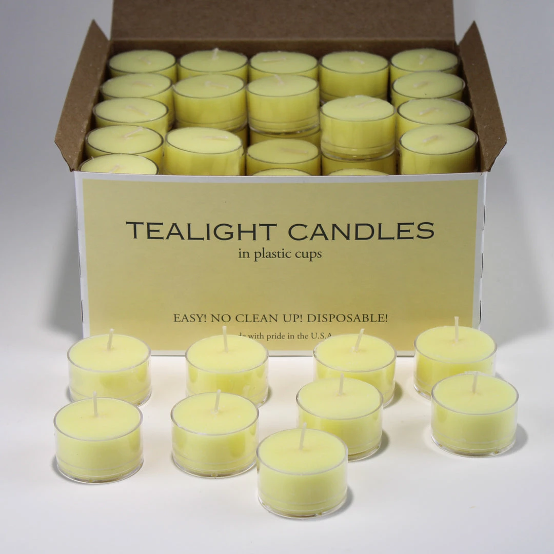 These are Light Yellow Unscented Tealights in Clear Plastic Cups. Disposable and easy to clean up, Clear Cup Tealights have all the benefits of our regular Tealights with the aesthetic look of a clear cup. These Tealight Candles are great to use in any application where the Tealight Candle is visible. Our Clear Cup Tealight Candles are a great value and perfect for weddings, restaurants and parties. They can be used in potpourri burners, food warmers or standard Tealight Holders.