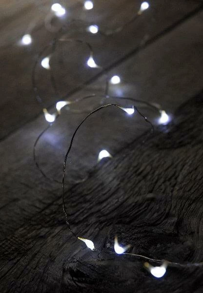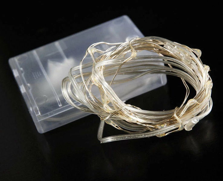 These 11 feet long tiny micro Cool White LED lights are on a silver wire. Each is battery operated and requires 3 AA batteries (not included). The battery pack is 2.75in by 2in by .75in. Has on/off switch. These lights are tiny but bright! Has a long bendable wire. Great to use for wedding decorations.