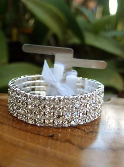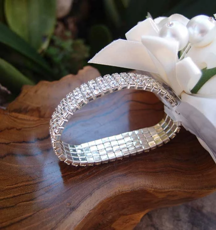 Adorn your wrist with this elegant elastic silver corsage bracelet with rhinestones. The bracelet is 1/2in wide with four rows of clear rhinestones in silver setting. It features a four fingered aluminum clip to attach fresh flowers, however the clip can be removed to make it a simple bracelet. One size fits most.