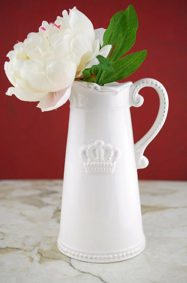 This Crown Ceramic White Pitcher is 9.5in tall x 4.8″ wide at the base. It is food and microwave safe. Makes a great vase also. This white pitcher is perfect for showcasing delicate, dried floral bunches and bouquets, yet its sturdy build makes it ideal for supporting full, fresh arrangements also. Has a raised crown design on one side.