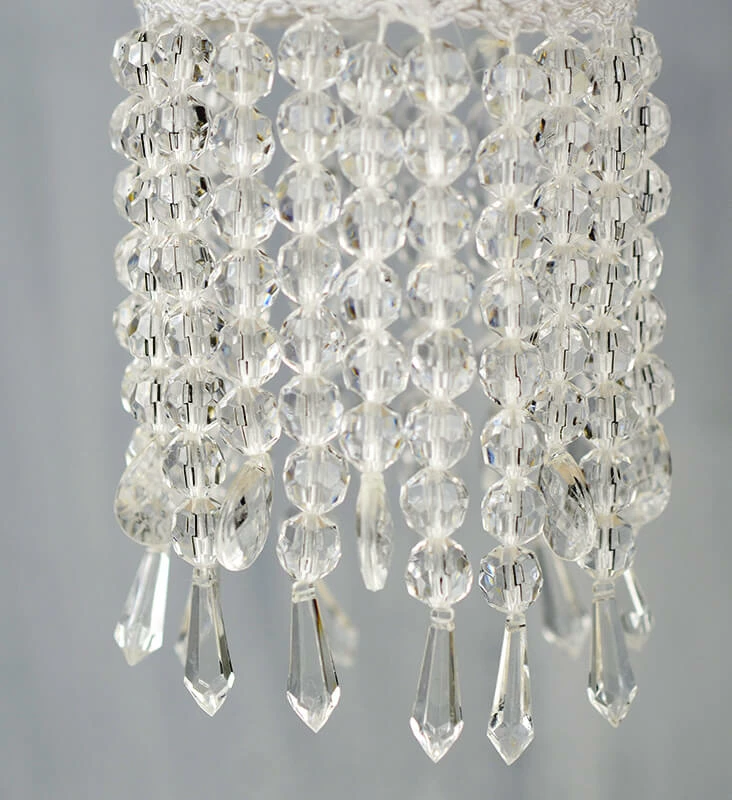 This is a 16″ white, even ribbing paper lantern bejeweled with acrylic crystals. The crystals are 4″ long. The lantern is paper and is 16″ wide. Perfect for a wedding! Both top and bottom of the lantern have cotton ribbon edging. Also available in 20″ and 12″