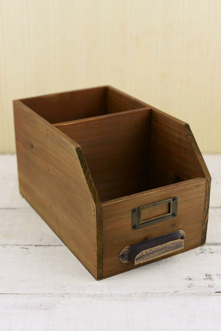 The Wood Desk Organizer looks just like it was pulled from an old library card cabinet. Use this stylish wood bin to organize your pens, notepads, and envelopes at work. The wood organizer has two compartments and is also handy for keeping paint brushes and craft supplies neatly arranged. This piece measures 10.5″ long by 6″ wide and can also be used to organize mail or cards at a wedding looking to add a vintage inspired element.