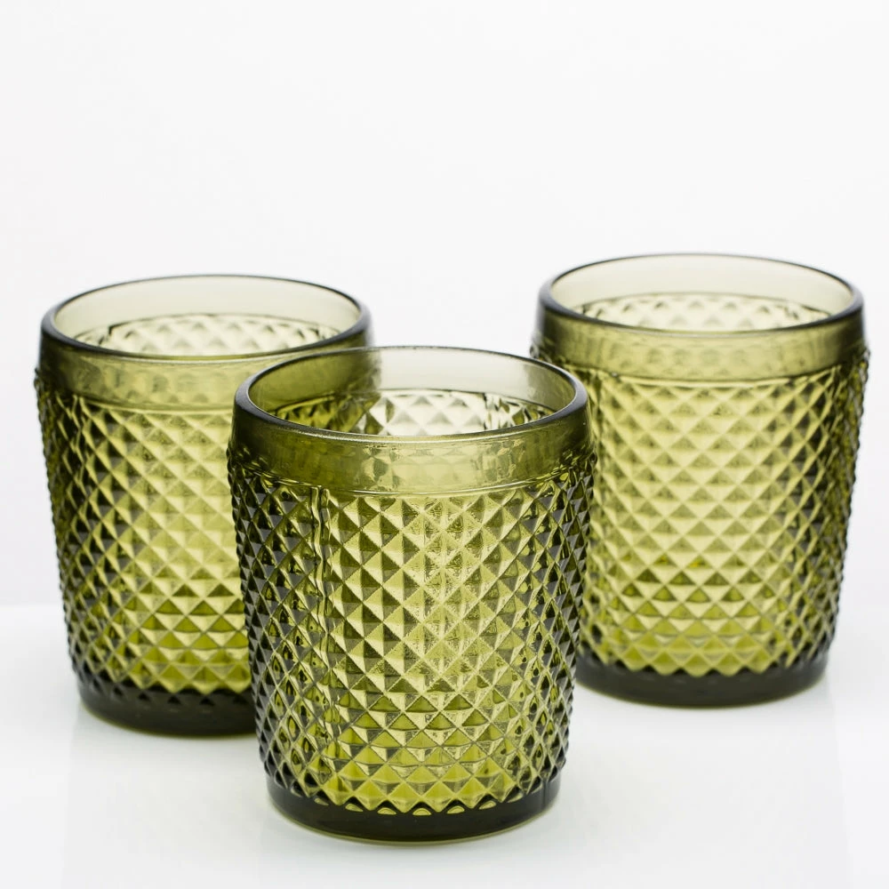 Brilliant! The texture and color this candle holder gives is everything! With a tealight or votive candle inside, the effect is stunning. The raised diamond detail in the glass creates a different kind candlelight ambience that everyone will love – great for special events, restaurants, and in the home. This candle holder comes in amber, dark green, navy blue, purple, red and clear to mix and match for your perfect combination of color!