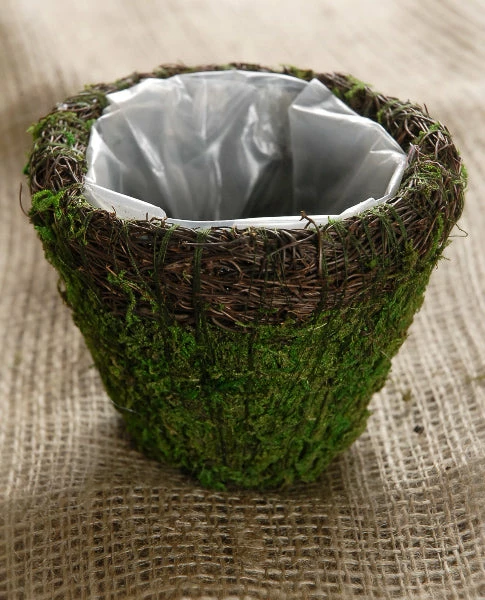 Bring a simple, natural component to your home or party decor with this webbed pot. The Moss Planter is composed of meshed wicker and preserved moss, and includes a plastic liner. It will wonderfully display dried wildflower bunches, or even potted succulents. For a striking decoration, plant sage in this pot, and display it on your front porch. 4″ tall.