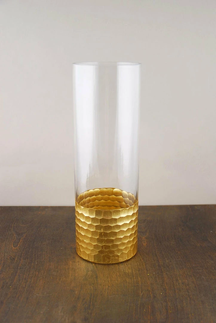 You will love this gorgeous Elsa Floral Vase & Candle Holder 12″ . This versatile piece is perfect for tall flower arrangements or for use as a pillar candle holder! Two uses – one low price! This clear glass cylinder vase has contemporary styling with a dimpled honeycomb pattern around the base. This glamorous gold-dipped vase is great choice for weddings and special events; or as a lovely accent piece in your home or office!