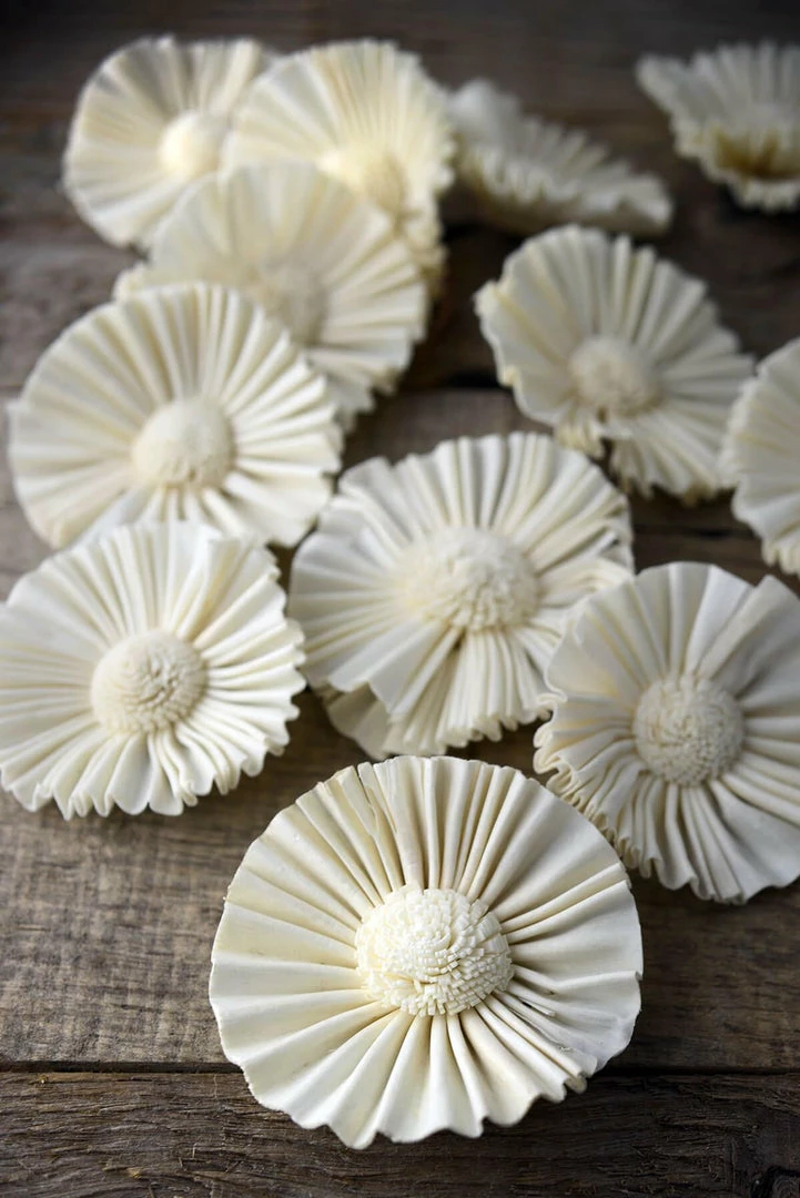 A 12-pack of sola moon flowers. Each is 2.5″ to 3″ wide. Handmade flowers that are made from tapioca wood peel. Sola wood- is an entirely natural product derived from the tapioca plant. Make into bouquets, table number holders, decorations.