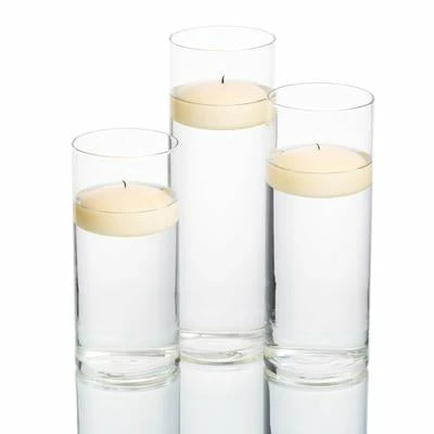 This ready to use graduated set of Cylinder Vases with Floating Candles takes the guessing out of decorating! With tiered sizes that add dimension to your table, this set is simply perfect! The beautiful, dramatic effect of crystal clear glass and floating candles can illuminate and delight any location. Add vase fillers, stones, or glass gems in the bottom to easily enhance your color theme or incorporate your personal touch.