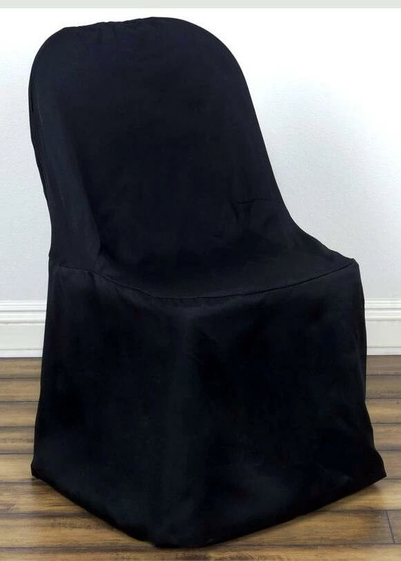 Bring classic luxury to your formal wedding with the Black Folding Chair Cover. This piece brings minimal elegance to your wedding reception seating, or black tie dinner. For a mesmerizing display, create large sashes out of white organza, and add stunning detail by placing a small bouquet of red flowers in the knot of the sash. The measurements of this cover are: height (top to bottom) 31.5in; back 20in wide; chair seat 18.5in wide by 16in high; chair leg 17.5in. Chair sashes are sold separately.