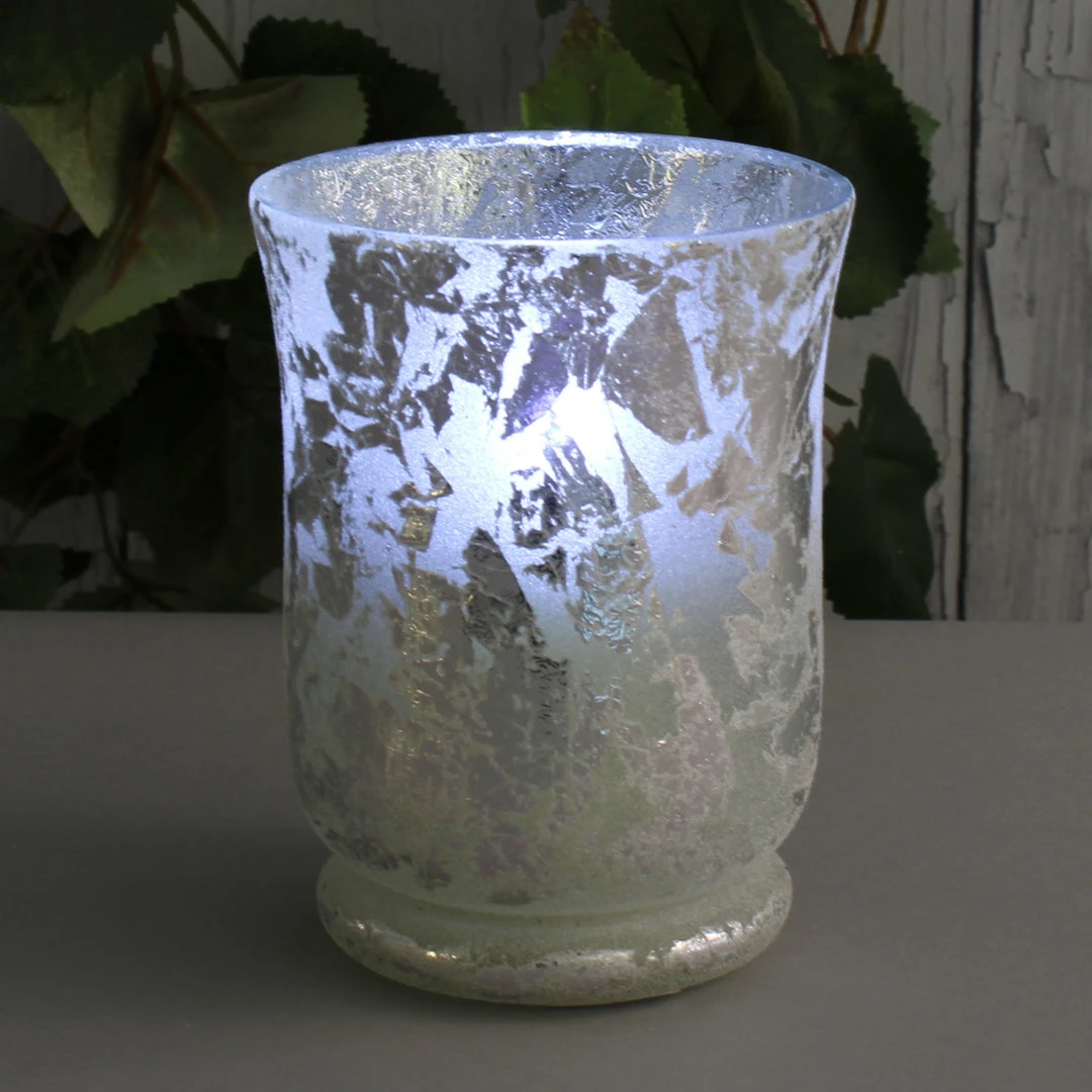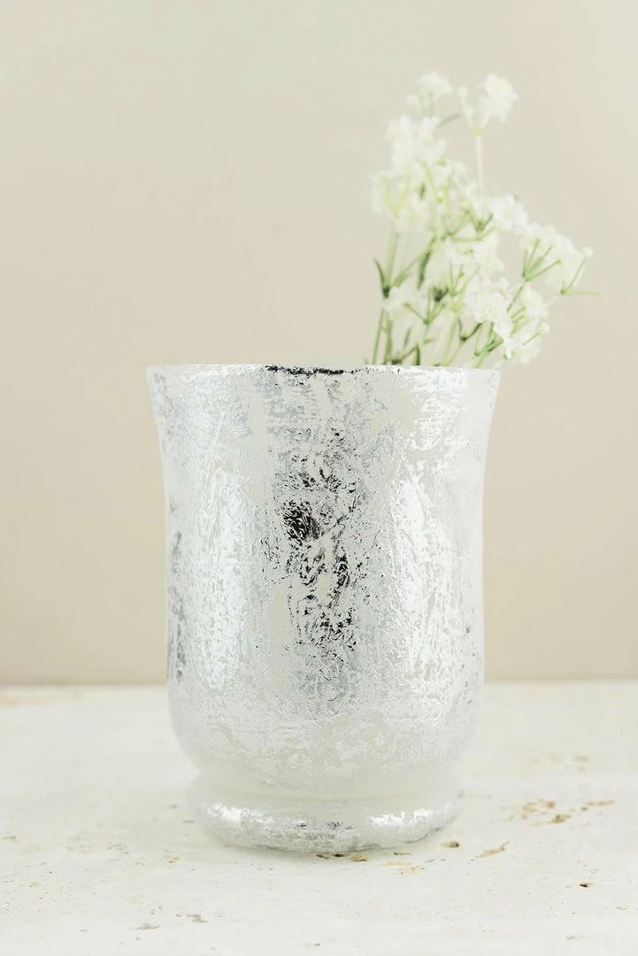 This  Mercury Glass Hurricane Vase and Candleholder in Frosted Silver has a beautifully textured coating and elegant curves. It measures approximately 4.5″ wide and 5-7/8″ tall, and can be filled with either a delicate floral arrangement, or a small candle to create soft, flecked light on your reception tables. This vase will bring an ethereal glow to your home with its reflective surface and brushes of metallic foil and velvety frost texture. Not guaranteed to be dishwasher or detergent soap safe.Â