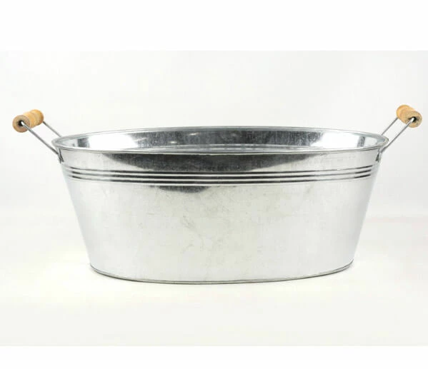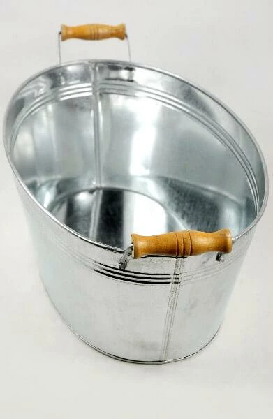 This quaint, industrial pail adds simple beauty to your home decor or gathering. Display the harvests of fall, such as apples, persimmons, and colorful leaves in the Oval Galvanized Tub with Wood Handles. Or, use to hold large floral displays at an outdoor wedding. This tub measures 15.5in long, 9.5in wide, and 6in deep. The bottom is 12.5in long and 7in wide.
