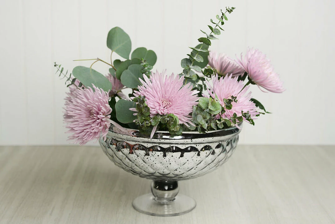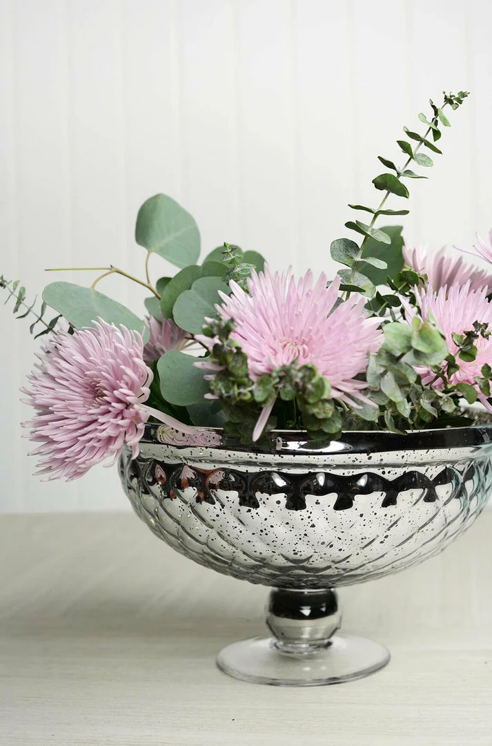 Give your tables some shine and flair with this Silver Mercury Glass Pedestal Bowl 12×7.5in! This large raised glass compote bowl features a reflective silver finish, diamond pattern texture, and elegant shape atop a small pedestal and round clear glass base. It is the perfect vessel to hold big lush bloom floral arrangements. The mercury glass accents make for a sparkling tablescape when surrounded by tealight candles.Â