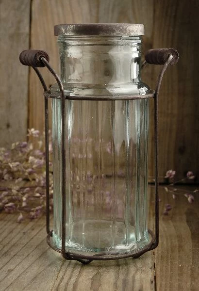 This cylinder glass potpourri jar would also make a creative vase. The glass jar is 7.5″ tall, 4″ wide, with a 2″ wide neck and ribbed texture. The metal lid has holes in it, perfect for flower stems. It comes in a rustic metal stand that is 7″ tall and 5″ wide – distressed for added appeal. The lid sits on the top of the vase and does not screw on; so it is easily removable. This jar is a great choice for spring parties, casual wedding receptions, or as a charming accent in your home.Â