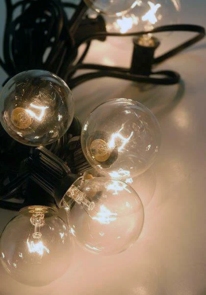 Globe and Paper Lantern Lights (for 12″ -24″ lanterns) Has 10 -5 watt C7 Candelabra Base G40 bulbs with 24″ spacing. The Black Cord is 22.5 feet long. Has a 2′ lead cord on each end. Each C7 socket comes with a 5 watt clear bulb, each bulb is 1.5″ wide. Looks great with 12, 14, 16, 18 & 20″ paper lanterns. This string can be used for indoors or dry outdoor use, connect up to 3 sets of these lights together. UL Listed plugs.