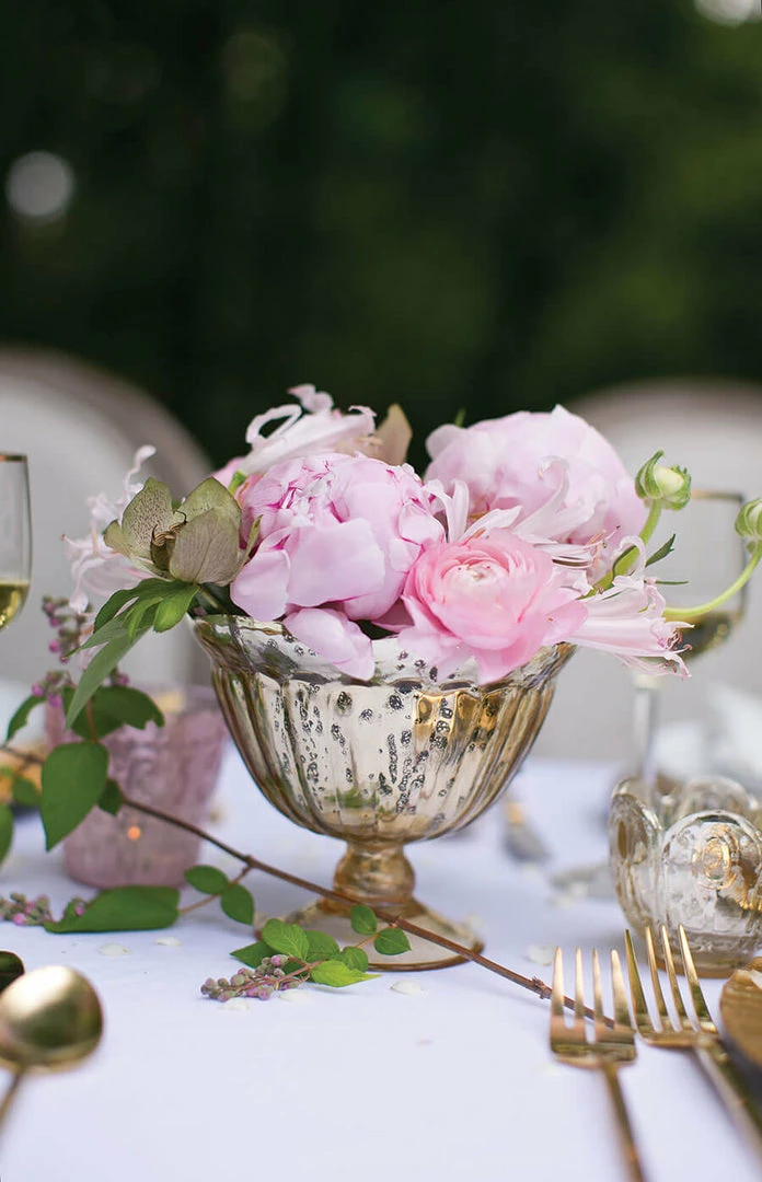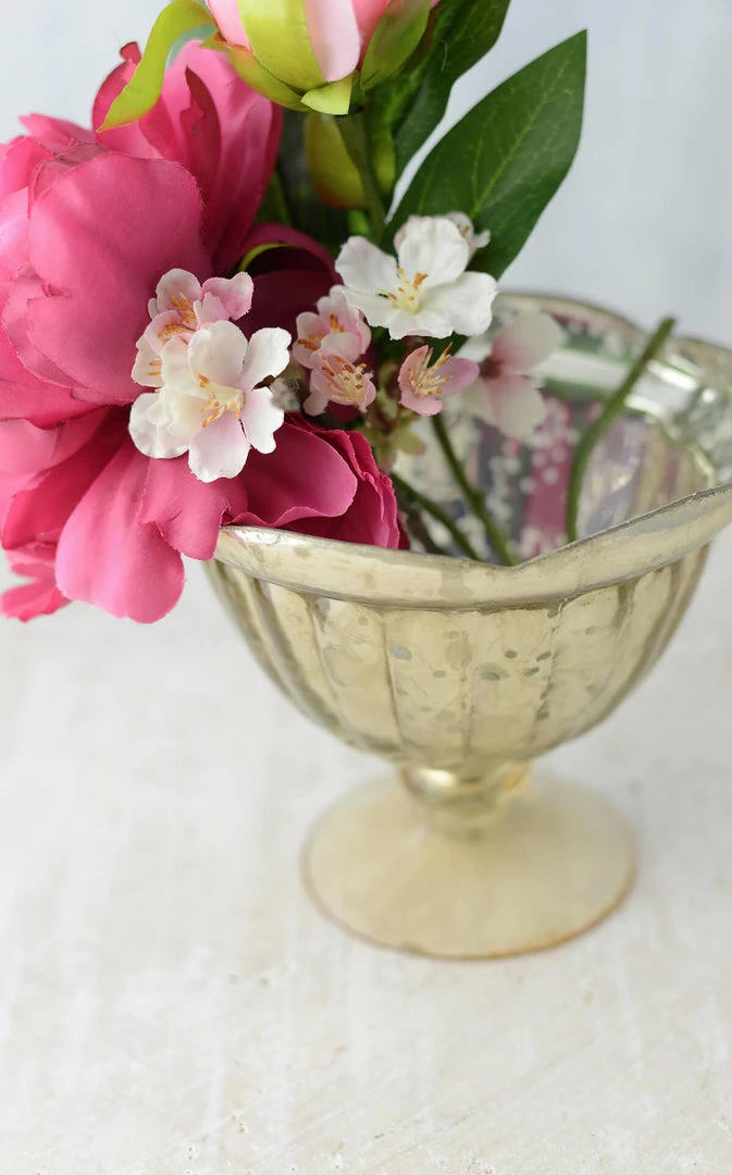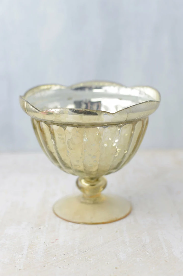 The Gold Carraway Compote Vase is has a dappled gold mercury glass finish that is translucent enough to let a few slivers of light seep through, and reflect the rest off of the silver interior. Use this raised, small bowl compote to illuminate a luxurious evening party. The scalloped opening, slightly ribbed bowl, and charming pedestal makes this item perfect for events such as weddings and dinner parties. For an elegant, eye catching centerpiece, fill this vase with floating candles or LED lights; and enjoy the glow!