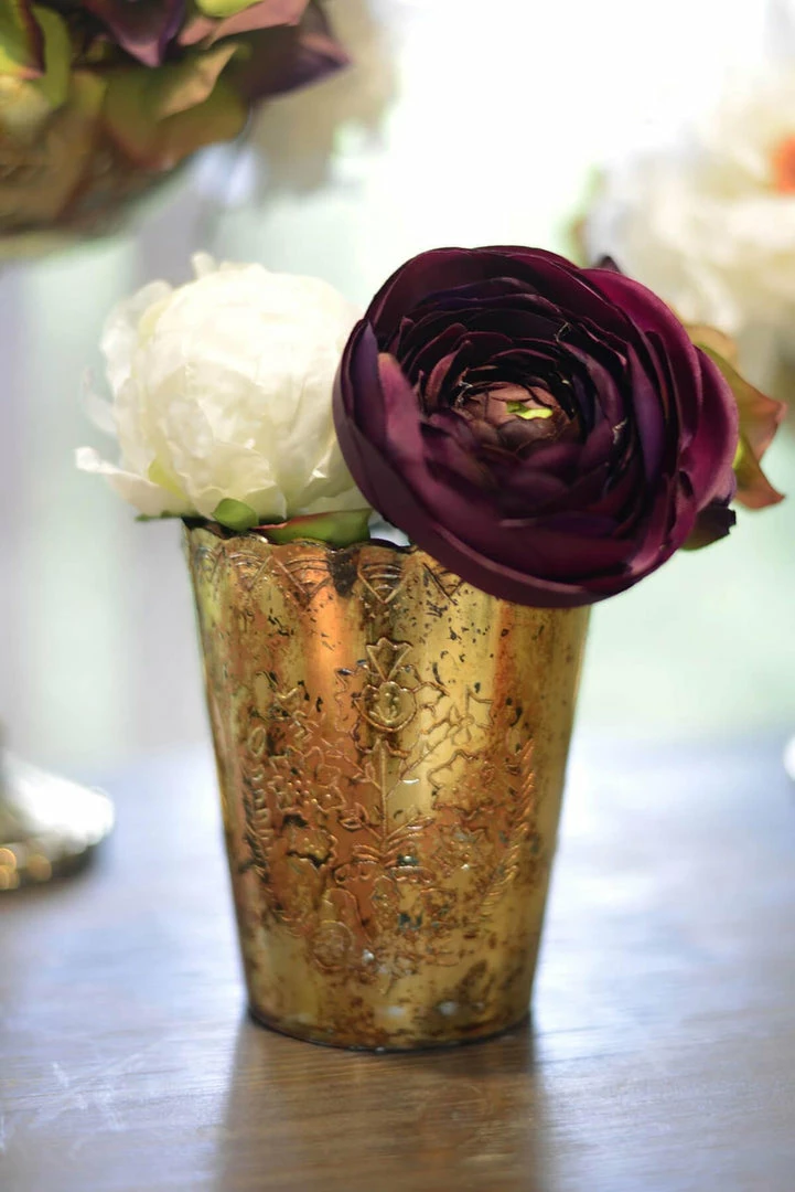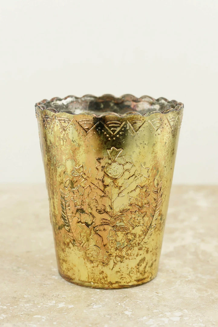 Give your etagere a gorgeous metallic accent with the Desiray Mercury Glass Votive Holder in Gold. This gold mercury dappled candle holder stands by its namesake as a longed for, desirable piece. It has an antique metallic finish, scalloped rim, and a raised floral design on the outside. Made of thick glass, this sturdy little vessel can also be used to hold small floral arrangements. The outer finish is gold and the inner finish is silver. Use several of them to decorate a long banquet table, or to adorn a fireplace mantel.