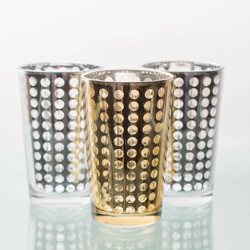 Metallics are in! Our fabulous line of silver, gold, and rose gold metallic glass holders will make your home or event a little more magical. This tall and narrow holder features quality glass, a gold metallic dotted design, and elegant tapered shape. Add our Richland Votive or Tealight Candle options to complete your look (candles not included). Candlelight illuminates the holder, providing a captivating glow through the dots of the design. Not dishwasher or detergent soap safe.Â