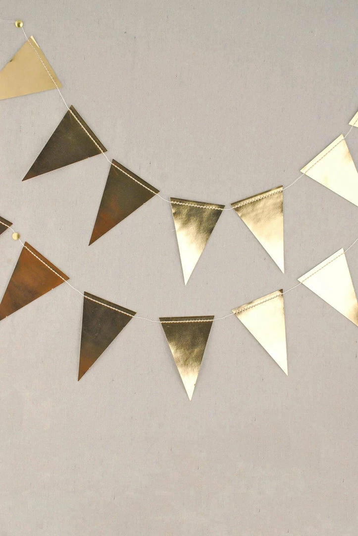 Metallic Gold Pennant Banner 10 Feet. There are 32 gold foil triangle pieces stitched together, approximately 8 ft long. Adorn your party with this winsome Mini Banner in Gold! This 10ft banner includes 32 shimmering gold pennants made with metallic foil cardstock. Suspend this mini triangle bunting over a dessert table, or use it to add a festive accent to your photo booth. Each of the paper triangles are sewn together with white thread and are one sided only.