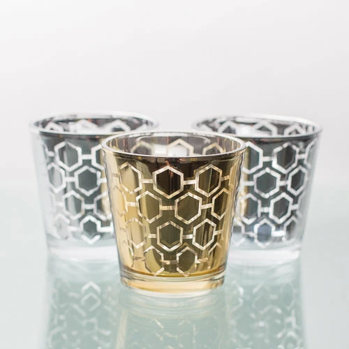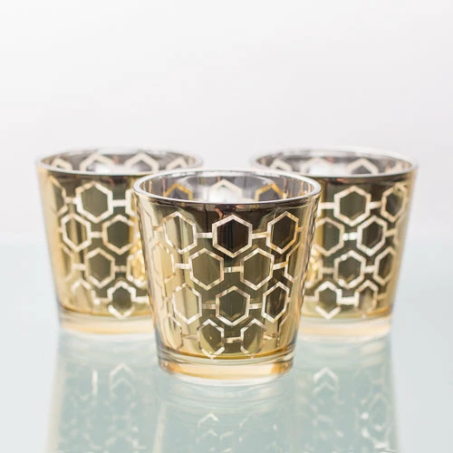 Metallics are in! Our fabulous line of silver and gold metallic glass holders will make your home or event a little more magical. This medium size holder features quality glass, a gold metallic hexagon design, and tapered shape. Add our Richland Votive or Tealight Candle options to complete your look (candles not included). The candlelight shining through the design of the holder creates an amazing ambiance on tables and surfaces. Not dishwasher or detergent soap safe.Â