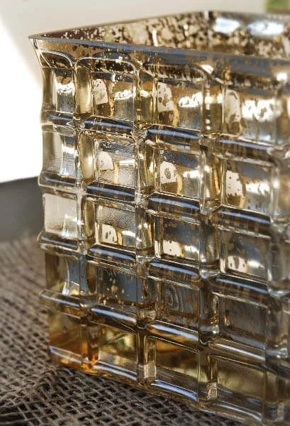 Set the stage for a dazzling display of flaxen, reflective light with this piece. The Gold Mercury Glass Cube Vase is composed of mirrored squares, and accents a glamorous environment. Fill this vase with delicate bouquets of flowers or candles. Create an eye-catching arrangement by filling this piece with water and floating candles, or floralytes to allow its golden glow to illuminate its surroundings. This vase measures 4.75″ cubed, and contains absolutely no mercury.