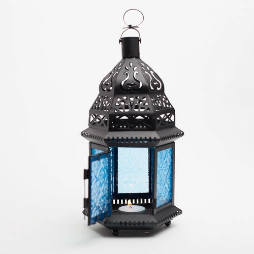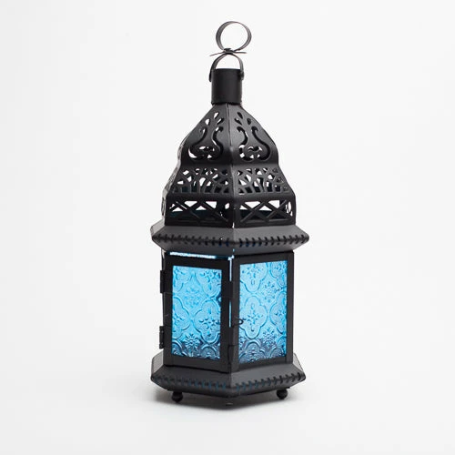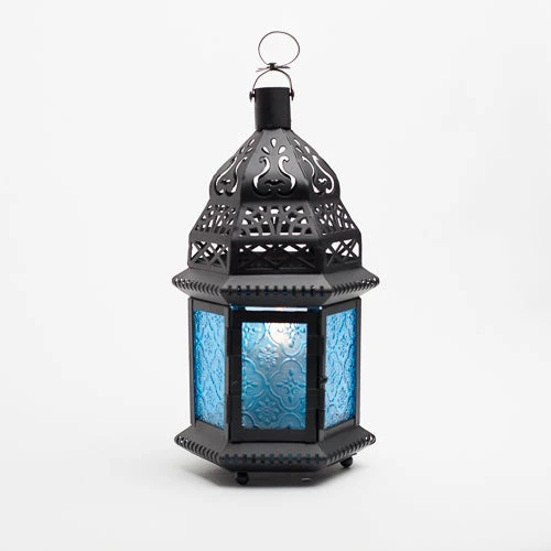 The mystery and glamour of our Moroccan lanterns amp up your design element! Gorgeous standing lanterns with the Moroccan design in the metal and the embossed colored glass lend to the intrigue. With a standing feature, this lantern also boasts a top hanging feature so you can change up your look from hanging to standing to fit your setting! (1) Lantern Included (Blue glass).Â