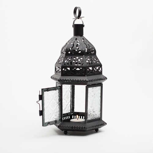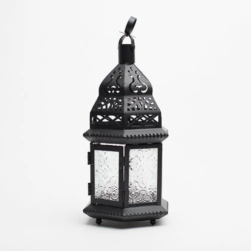The mystery and glamour of our Moroccan lanterns amp up your design element! Gorgeous standing lanterns with the Moroccan design in the metal and the embossed clear glass lend to the intrigue. With a standing feature, this lantern also boasts a top hanging feature so you can change up your look from hanging to standing to fit your setting! (1) Lantern Included.Â