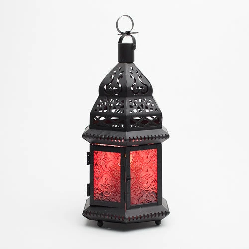 The mystery and glamour of our Moroccan lanterns amp up your design element! Gorgeous standing lanterns with the Moroccan design in the metal and the embossed colored glass lend to the intrigue. With a standing feature, this lantern also boasts a top hanging feature so you can change up your look from hanging to standing to fit your setting! Fill this lantern with tealight candles or 2″ x 3″ pillar candles to get just the right glow. Offered in green, red, orange, blue, and clear!