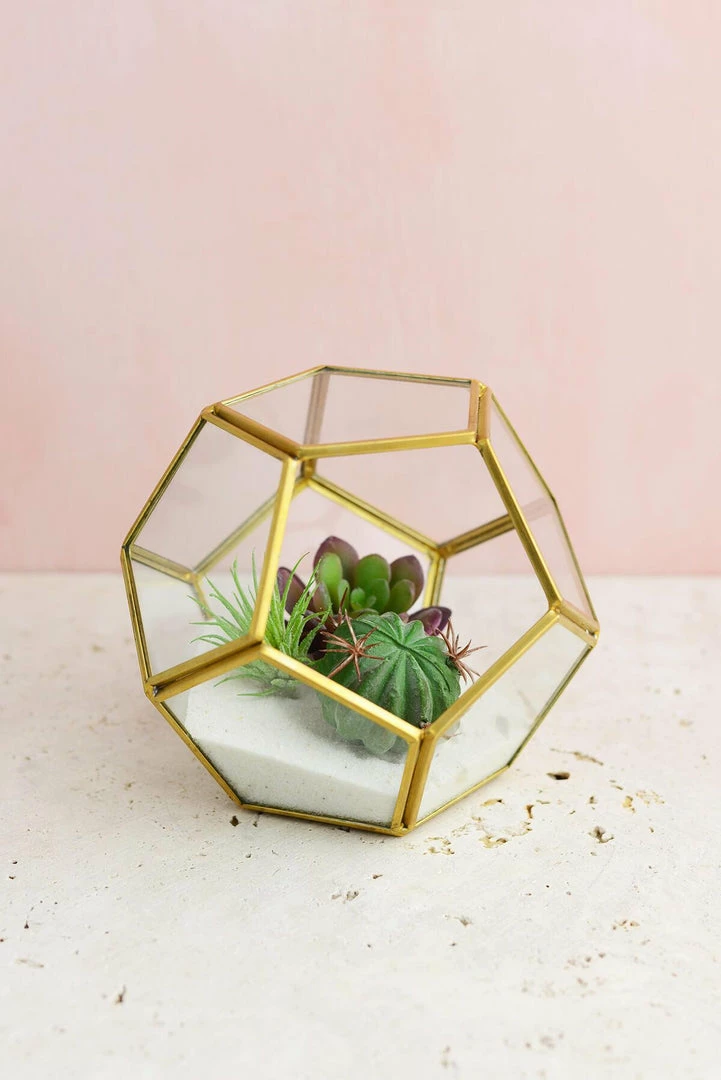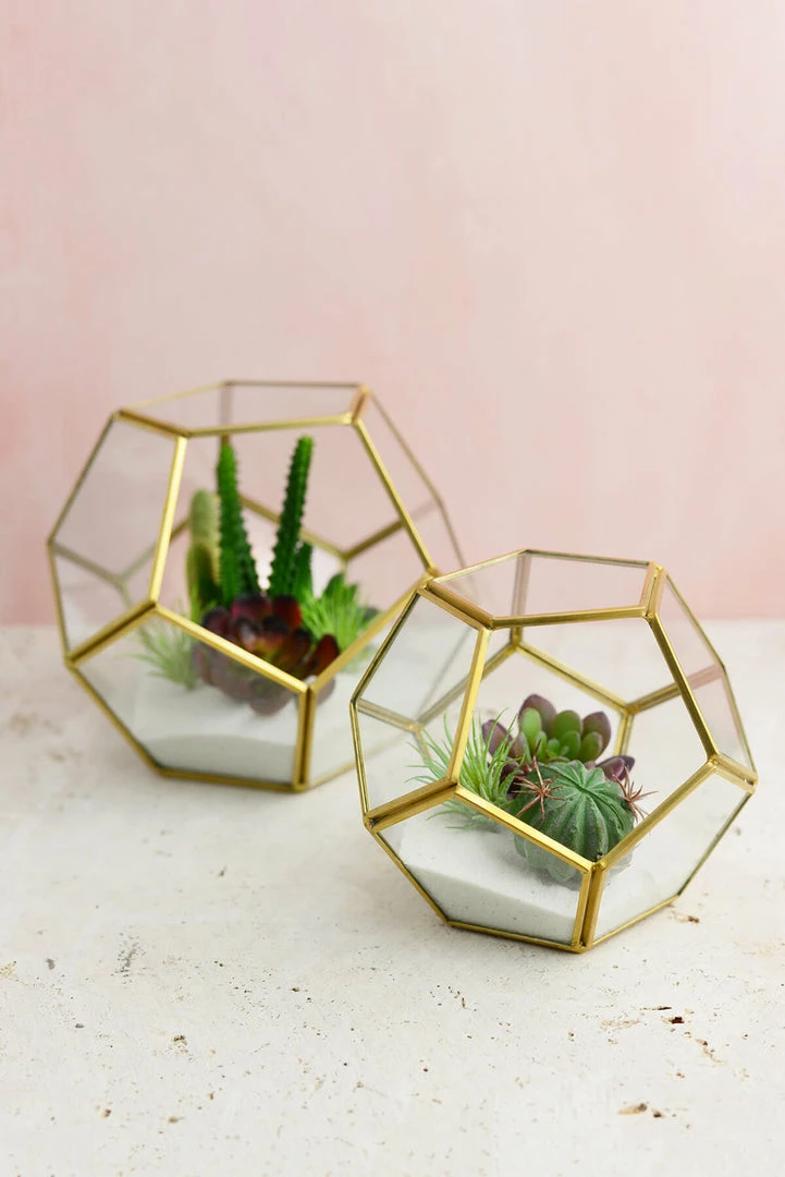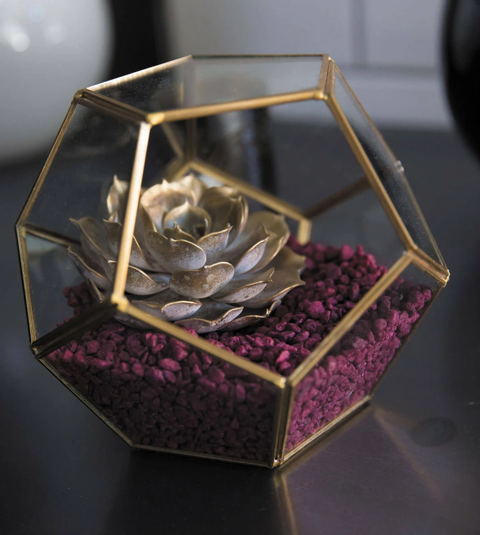 Get geometric with the Glass Terrarium Pentagon with Brass edges! This little display case is in the shape of a dodecahedron and measures approximately 4-5/8″ tall and 5.5″ wide. Layer it with soil, moss, and succulents for a charming little terrarium arrangement to place on your banquet tables. Put little pebbles inside and light a tea light candle from its center. The Hira Glass Terrarium Pentagon also comes in a larger size.