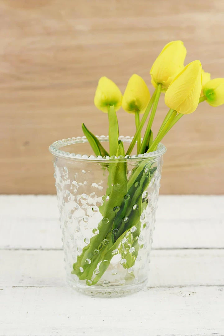 This clear glass vase with hobnail/dotted texturing measures 5″ tall by 4″ wide (base is 3″ wide).Â