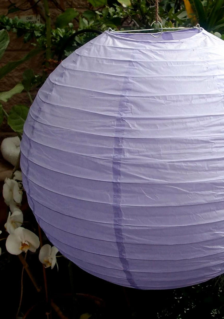 Bring eye-catching color to your special event or party with these Lavender Paper Lanterns! Hang the lantern high and fill with string lights to illuminate, hang from trees for an outdoor gathering, or group them above tables and buffets. These whimsical lanterns can also be used to add pops of color in bedrooms and offices! Paper Lanterns are a festive and economical way to enhance atmosphere in any setting. Our lanterns are easy to use and can be folded back flat and re-used time and time again!Â