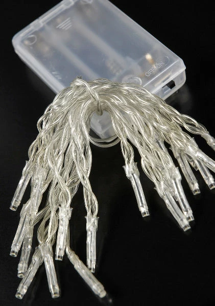 Bring radiance to your home or party with this strand of Clear LED Lights. Featuring 20 raindrop bulbs on a clear wire, this string of dewy lights can be incorporated in floral arrangements, suspended from your living room ceiling, or wrapped around front porch pillars for a pleasant, glowing accent. The cord measures 7.5ft long and connects to a battery pack.