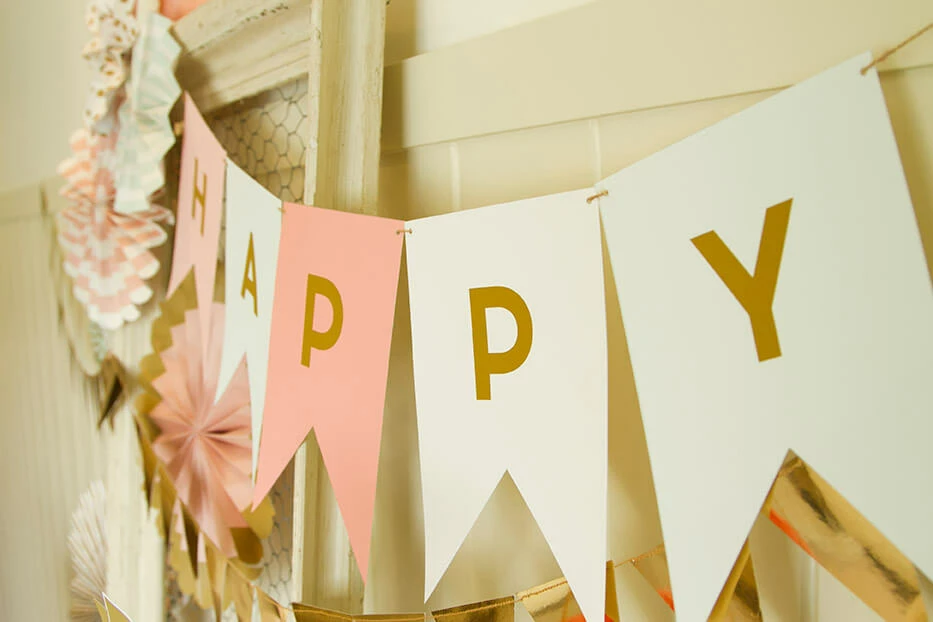 Personalize your party with the pastel Letter Banner! This kit includes gold foil letters printed on top of light pink, mint, cream, and black swallowtail pennants. There are 46 pennants in a pack and they each measure 6″ wide by 9″ tall. The bunting is made from sturdy cardstock and also comes with 3 yards of twine for hanging in front of your dessert table, or using as a backdrop at your summertime soiree.