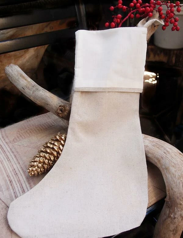 Create your own custom holiday decoration with this linen Christmas Stocking! Add your own personal touch by dip dying it, or applying a special print using transfer paper. Embellish this stocking with colorful ribbon. A natural linen stocking with a white cotton top and inside is fully lined. It measures 16″ tall with the foot being 9.5″ long, and the top 6″ wide. Has a 1″ loop on the top for hanging.